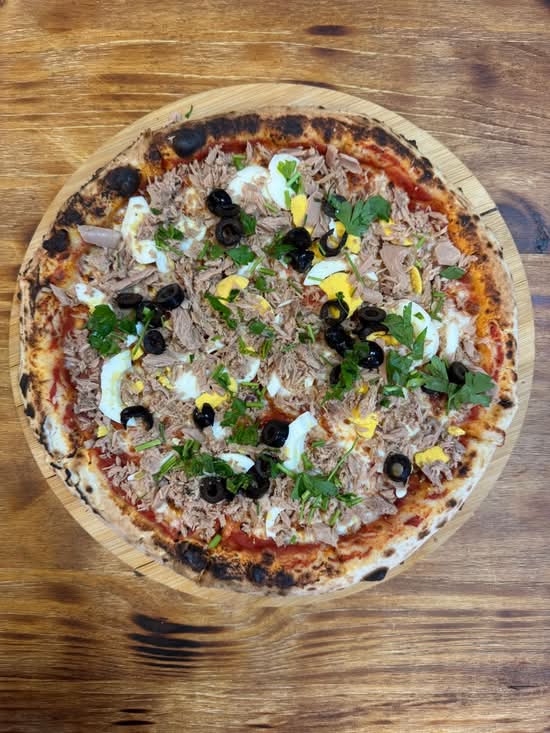 Une pizza à la tunisienne composée d’une sauce tomate, mozzarella, des oeufs, olives, persil et du thon.